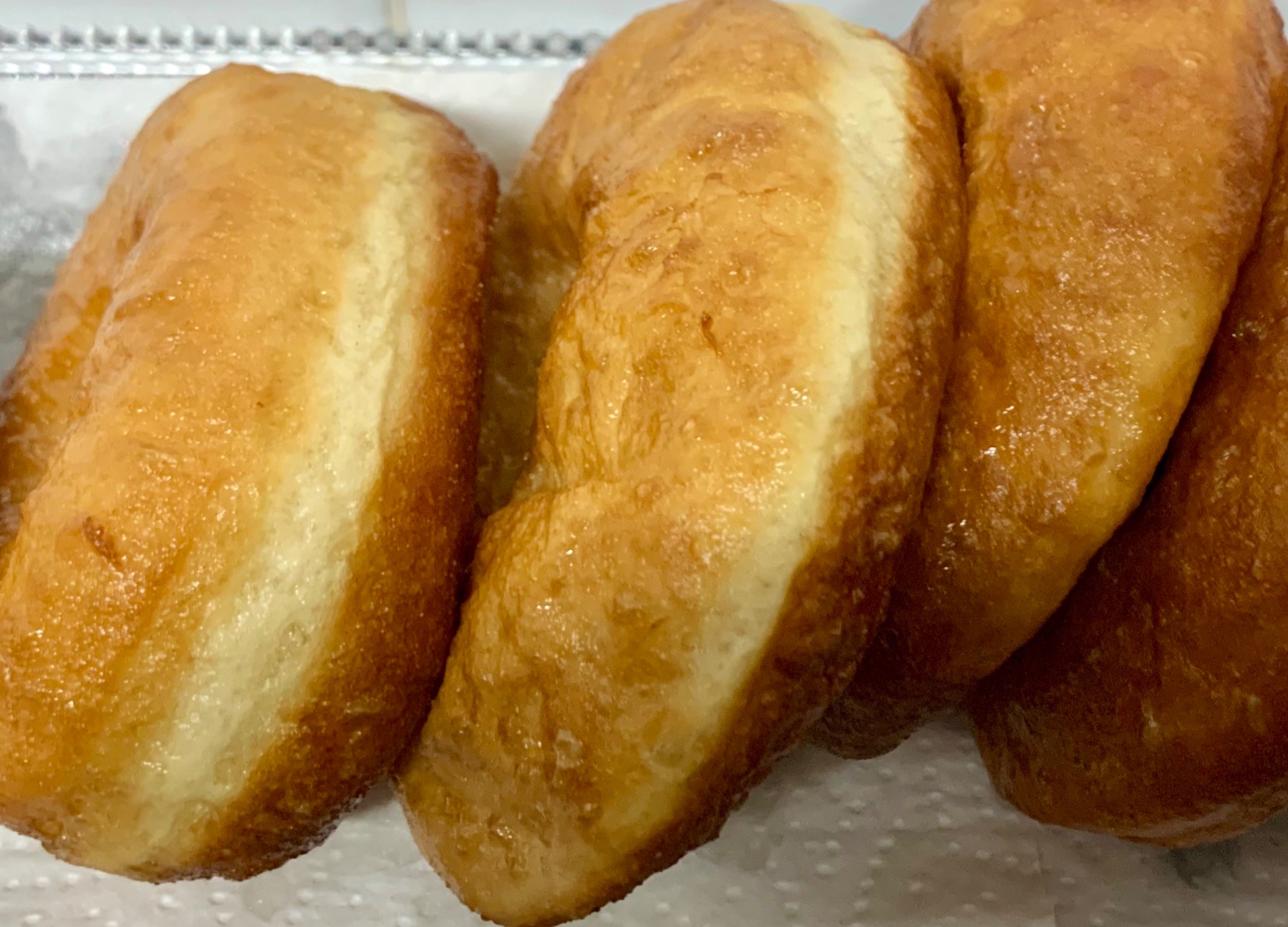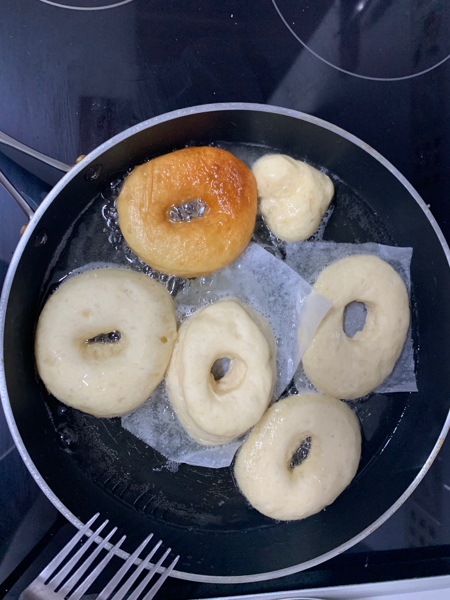 Por último freímos los donuts en abundante aceite, hasta que este dorado por cada lado. Si has puesto el papel de horno no tienes que tocar los donuts , los pones en la sartén (como se ve en la imagen) y luego le quitas el papel.