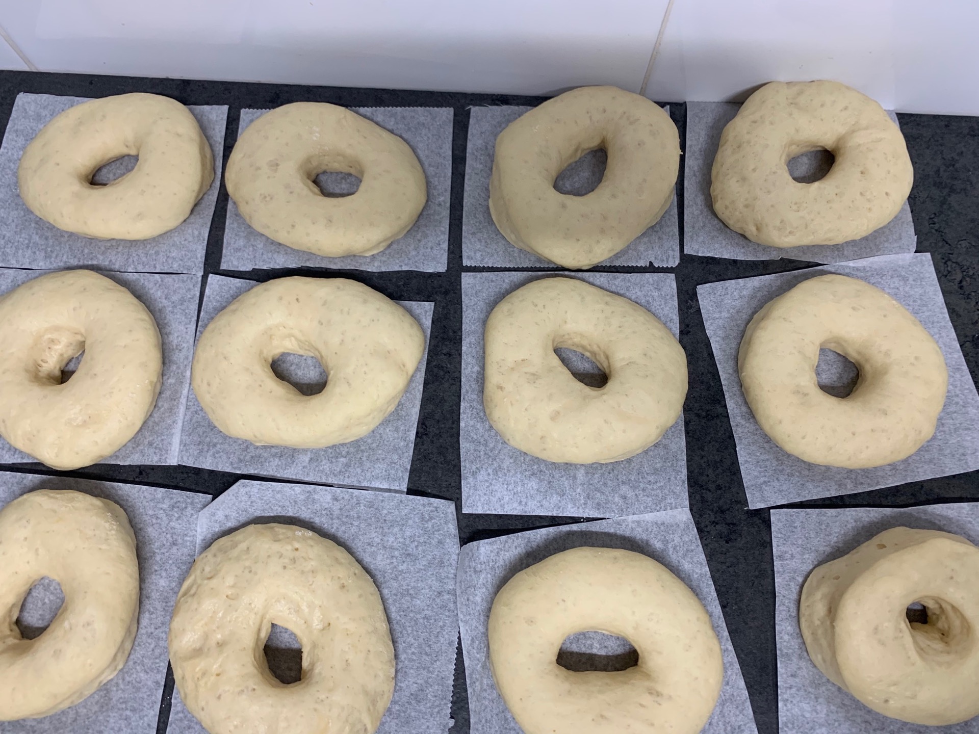 Una vez haya doblado la masa, la estiramos con cuidado para no quitar el aire a la masa, y vamos cortando los donuts con un cortapasas. Una vez estén los donuts cortados yo voy poniendo cada uno en un trozo de papel de horno (como se ve en la imagen) , al hacer esto luego no tienes que manejarlos con las manos y así evitas que la masa te baje a la hora de cocinarlos. Dejamos reposar los donuts 30/40 min.